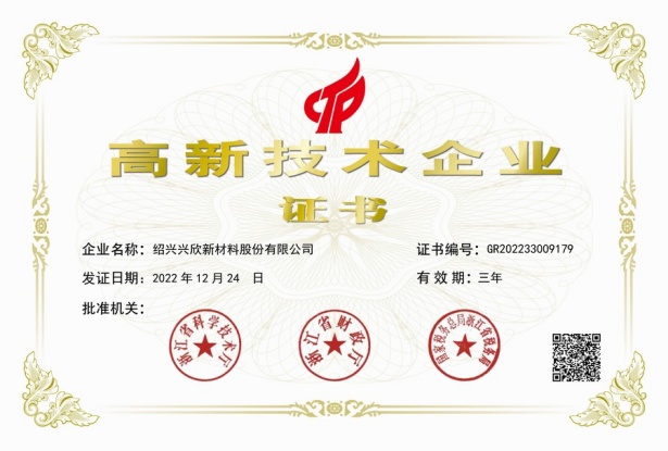 紹興興欣新材料股份有限公司成立于2002年06月27日,占地面積122畝,位于杭州灣上虞經(jīng)濟(jì)技術(shù)開發(fā)區(qū)拓展路2號(hào),現(xiàn)有職工200余人,專業(yè)技術(shù)人員50余人;博士、碩士研究生30余人組成的一支知識(shí)型、專業(yè)化的技術(shù)科研團(tuán)隊(duì)。公司面向全球市場(chǎng),專業(yè)開發(fā)電子化學(xué)品、環(huán)保化學(xué)品、醫(yī)藥中間體、高分子材料等先進(jìn)新材料重點(diǎn)領(lǐng)域的省級(jí)科技型企業(yè);建有浙江上虞、安徽東至兩個(gè)生產(chǎn)基地。目前為“國家高新技術(shù)企業(yè)”、浙江省“隱形冠軍”企業(yè)、浙江省專精特新中小企業(yè);建有“省級(jí)”研究開發(fā)中心,共建天津大學(xué)浙江紹興研究院電子化學(xué)品研發(fā)中心。